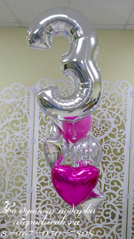 Фонтан на грузике с фольгированной цифрой "3"- ( в фонтане 3 фольгированные фигуры (2-звезды, 1-сердце), 1 шар б/рисунка, 1 шар "Конфетти", фольгированная цифра "3")