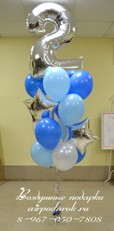 Фонтан на грузике с фольгированной цифрой "2"- ( в фонтане 2 фольгированные звезды, 13 шаров б/рисунка, фольгированная цифра "2")